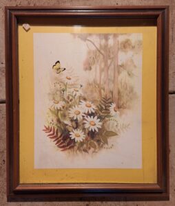 23 and 1/2 in wide by 27 1/2 in tall. The frame and glass is in really good shape. the print has come loose from the frame and needs to be reattached.