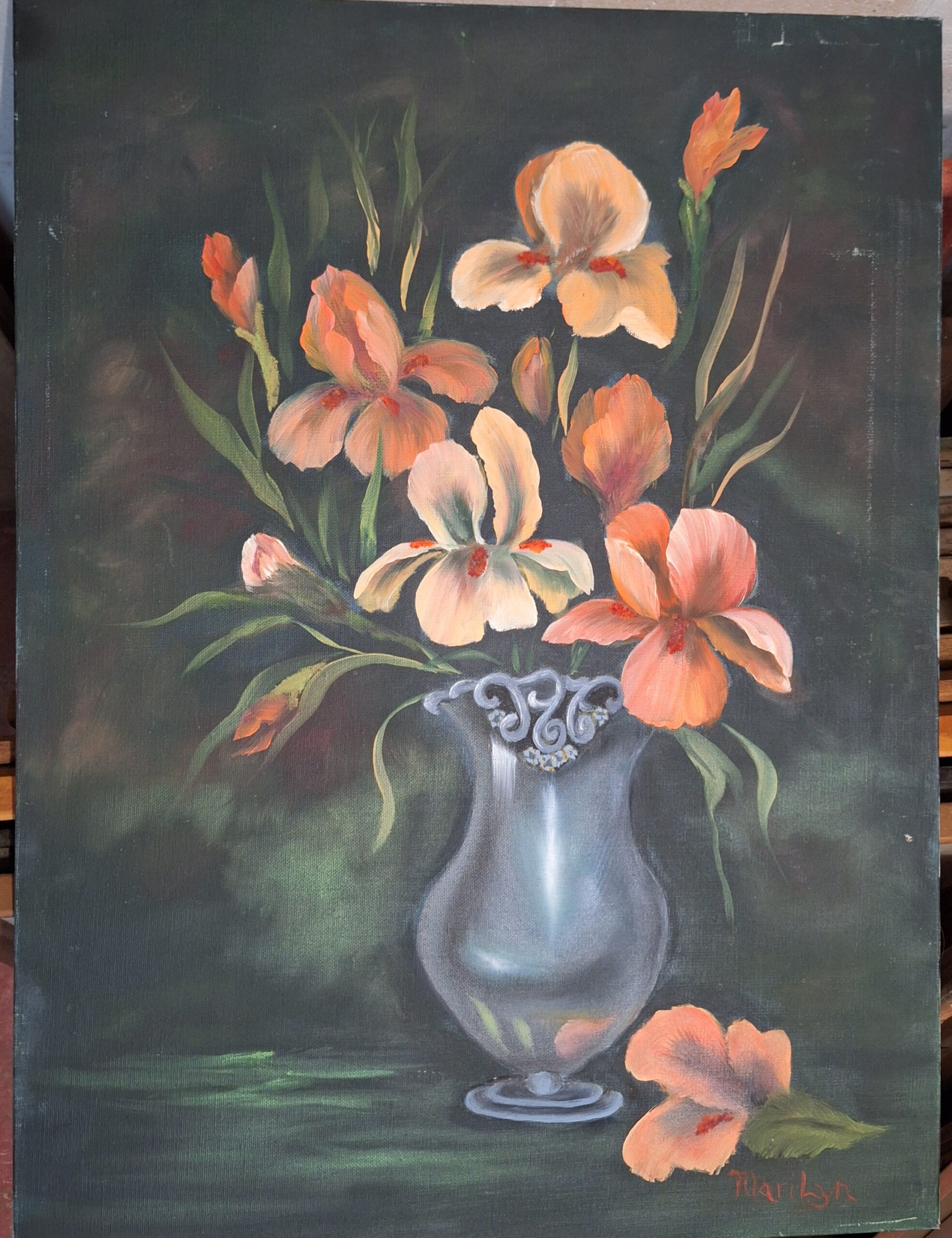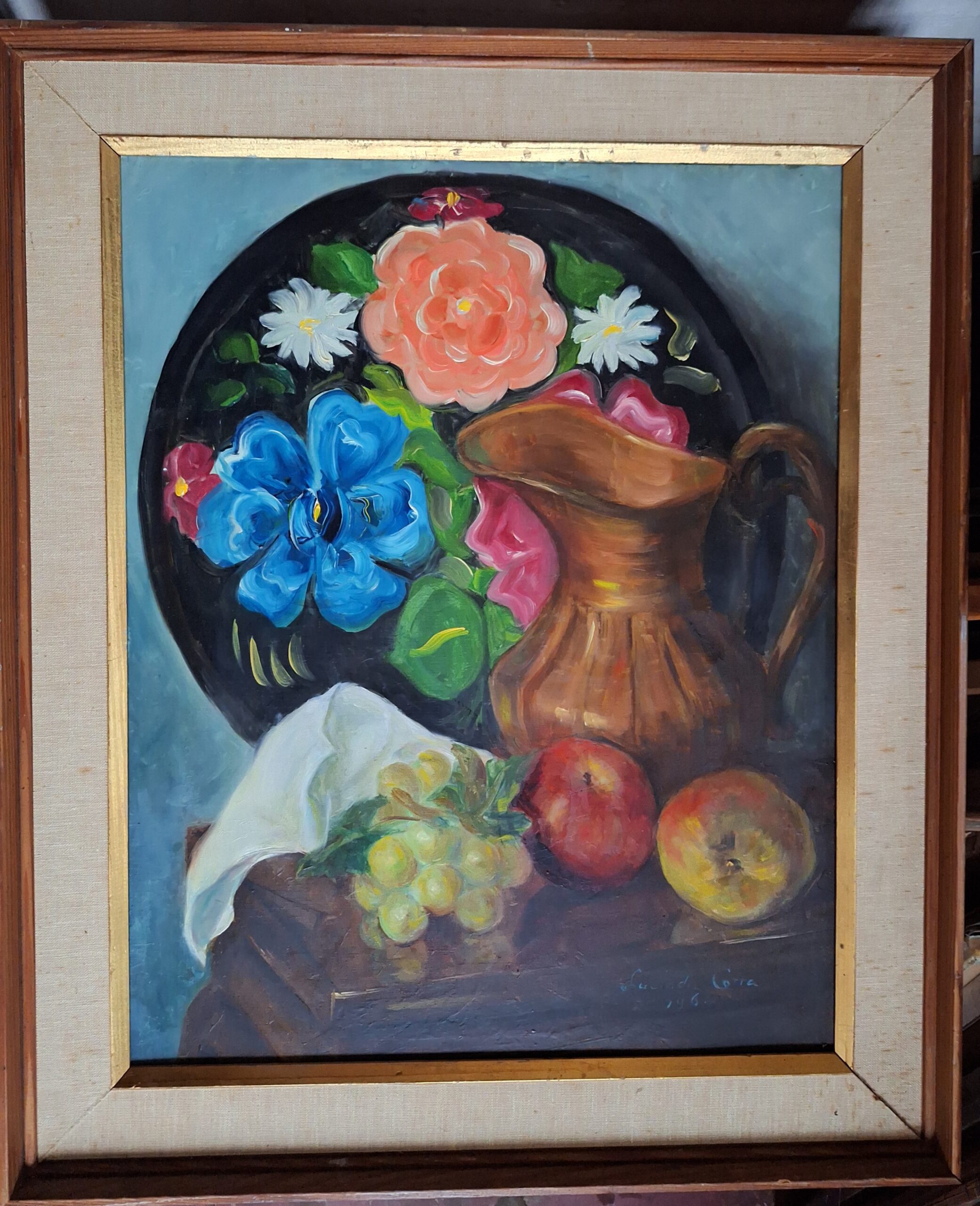 18 in wide by 24 in tall. It’s a really nice painting and excellent shape. Signed but not dated. Comes without a frame.