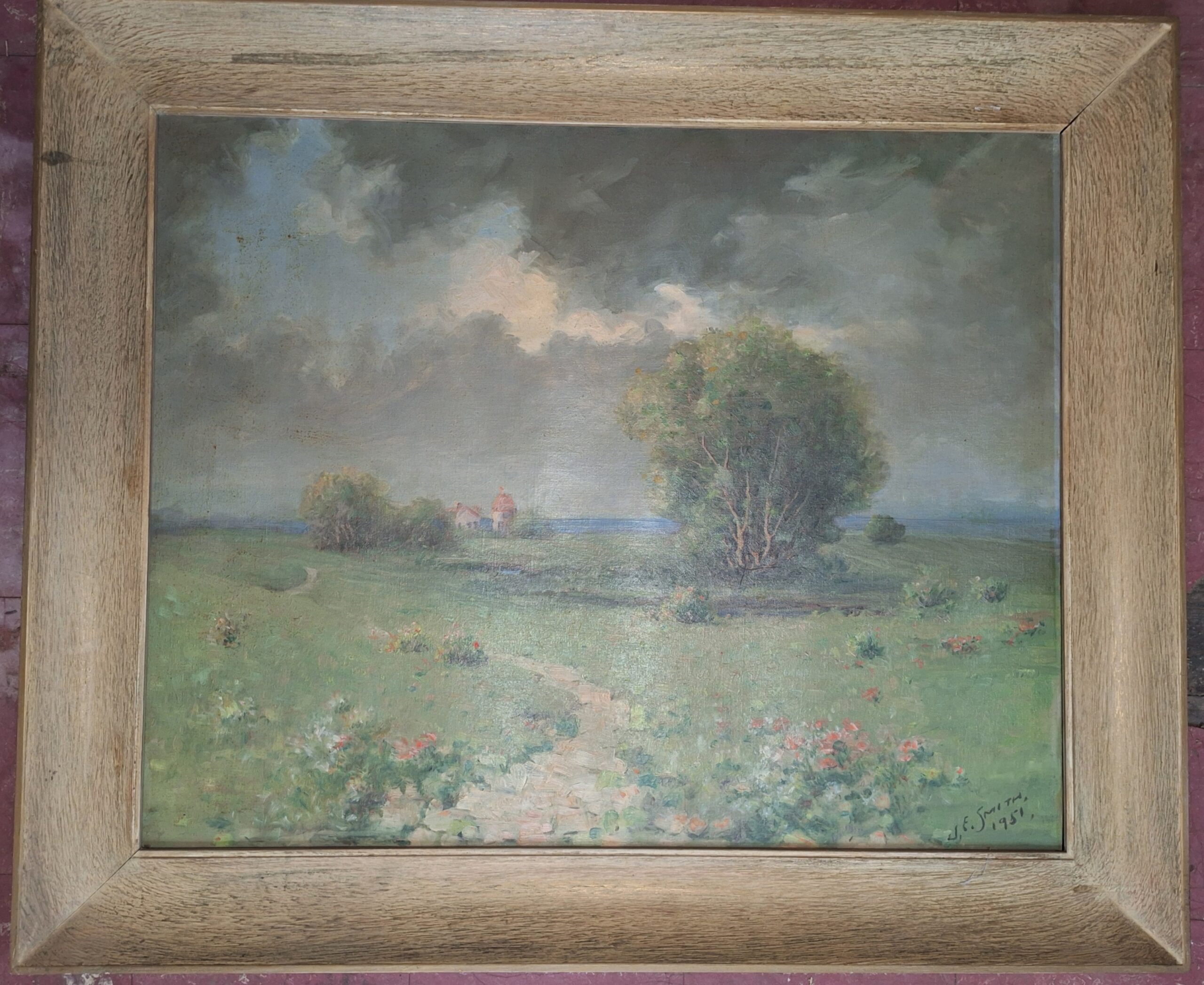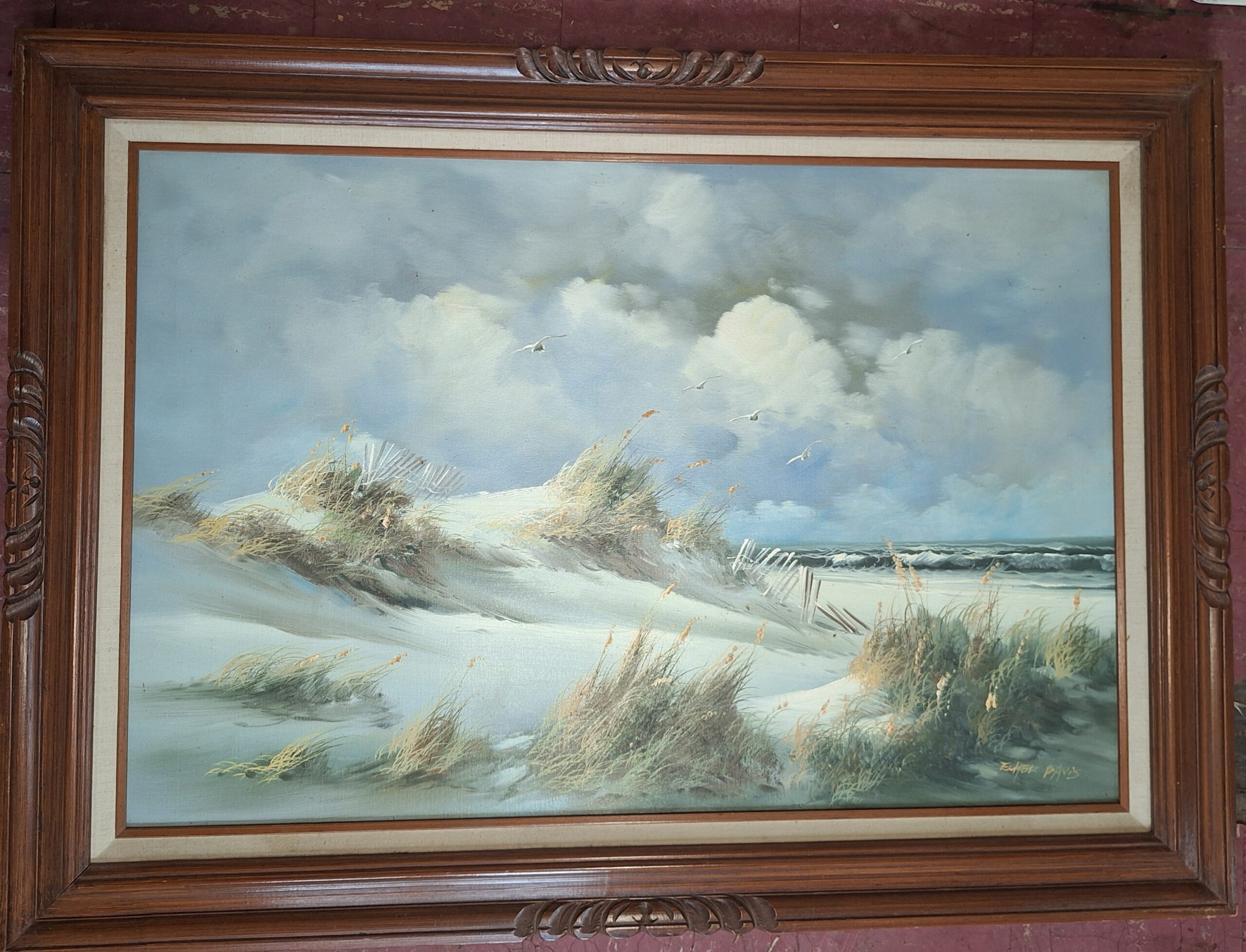 41 in wide by 29 in tall. Nothing special about the frame but it looks really good on this painting. Both painting and frame are a nice little condition signed but not dated.